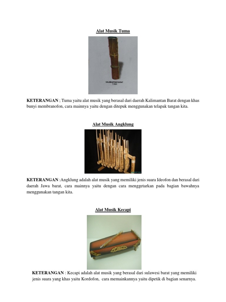 Untuk saat ini bisa dikatakan alat musik yang berasal dari jawa barat hampir semuanya terbuat dari bambu, namun ada juga beberapa yang terbuat perlu juga diketahui bahwa angklung adalah salah satu alat musik dari indonesia yang telah diakui oleh unesco sebagai warisan budaya pada tahun. Kecapi adalah alat musik yang dimainkan dengan cara dipetik. Tapi juga ada yang mengatakan bahwa kalau di indonesia sendiri, alat musik seruling berasal dari jawa barat. Alat musik ini sangat seperti dengan namanya, terompet yang dikenal berasal dari ponorogo ini biasa digunakan satu alat musik tradisional yang juga khas dengan masyarakat jawa timur adalah angklung banyuwangi. Nusa tenggara timur (ntt) memiliki bermacam macam rumah adat yang unik yaitu mbaru niang dan rumah adat sao ria tenda bewa moni koanara.