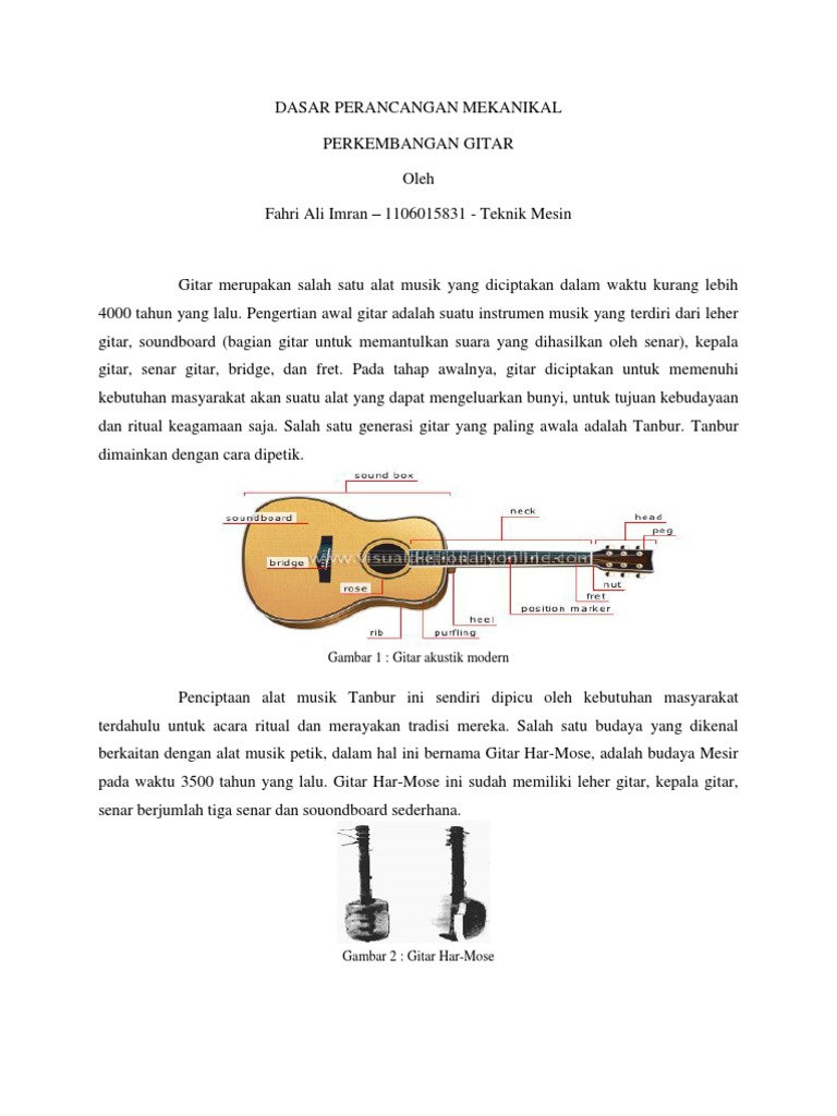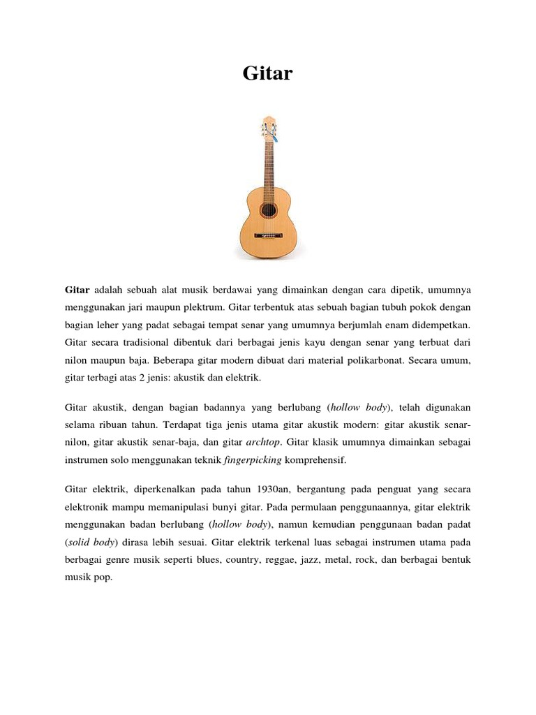 Gitar secara tradisional dibentuk dari berbagai jenis kayu dengan senar yang terbuat dari nilon maupun baja. Gitar terbentuk atas sebuah bagian tubuh pokok dengan bagian leher yang padat sebagai tempat senar yang umumnya berjumlah enam didempetkan. Gitar listrik yang pertama adalah gitar hollow bodied dengan pickup baja yang dibuat oleh pabrikan rickenbacker pada tahun 1931. Gitar terbentuk atas sebuah bagian tubuh pokok dengan bagian leher yang padat sebagai tempat senar yang umumnya berjumlah enam didempetkan. Hingga saat ini, gitar merupakan alat musik petik yang paling populer di dunia. Dalam bermain gitar bisa mengambil posisi duduk atau berdiri tergantung keadaan dan kenyamanannya. Makalah macammacam alat musik berdasarkan sumber bunyi tugas. Gitar canggih yang disebut juga dengan istilah gitar elektrik ini adalah alat musik jenis gitar yang mempergunakan media pickup yang menghasilkan arus listrik sehingga mengeluarkan getaran suara atau bunyi dari senar atau dawai (string). Ada 3 jenis alat musik yang di bedakan berdasarkan fungsinya, yaitu alat musik melodis, alat musik ritmis dan alat musik harmonis. Tapi ada juga yang mengatakan bahwa sejarah gitar dimulai jauh sebelum masehi yaitu pada jaman babilonia. Alat musik yang berasal dari pulau rote, nusa tenggara timur ini dimainkan dengan cara dipetik, sama seperti kecapi dan gitar. Musik merupakan bentukan seni yang mengandung irama serta bertujuan untuk hiburan. Inilah yang disebut sebagai alat musik modern.