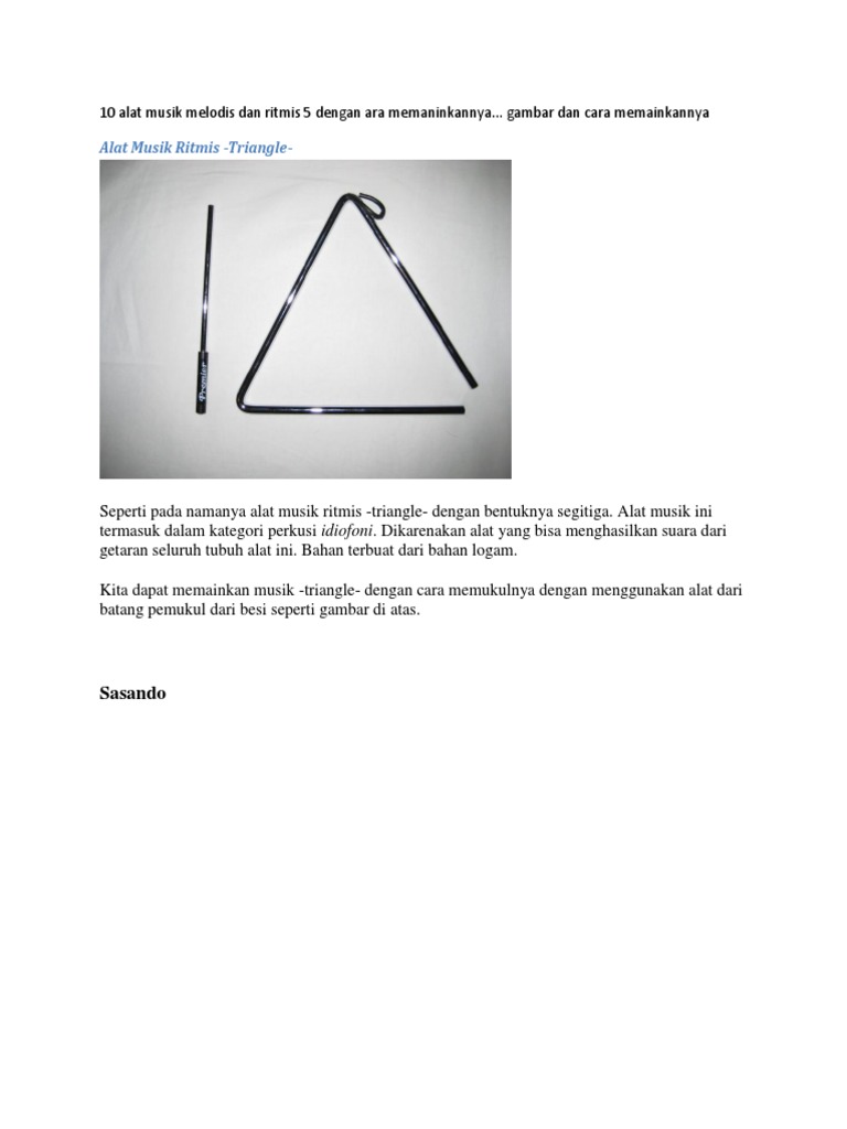 Nantinya ketika di pukul pada bagian benjolan atasnya akan menghasilkan bunyi yang nyaring, bunyi ini disebut dengan bunyi ideofon. 21 9 terompet lumut lichen. Triangle bisa mengeluarkan bunyi dengan dipukul pada bagian mana pun. 37 6 potret mode terompet. Beberapa contoh alat musik ini misalnya drum, marakas, simbol, tamborin, timpani, triangle, konga, timpani, kastanyet, rebana, tifa dan kendang. Salah satu contoh kecilnya adalah keberagaman alat musik tradisional berikut ini. Alat musik bonang berasal dari daerah jawa timur dan cara memainkan alat musik ini yaitu dengan dipukul menggunakan alat bantu pukulan seperti kayu. Alat musik ritmis memiliki ciri tersendiri dan artian yang berbeda dari alat musik lainnya, sehingga mampu menciptakan karakter yang unik. Pada umumnya alat musik triangle ini berbentuk segitiga sama sisi, namun dalam perkembangannya alat musik ini ada juga yang berbentuk segitiga sama kaki, dan dewasa ini ada triangle yang ditambahkan. Alat musik ritmis menjadi pemandu pemain musik lainnya dalam pengaturan tempo. Triangle adalah alat musik ritmis berbentuk segitiga yang dimainkan dengan cara dipukul menggunakan stik. Contoh alat musik ritmis 1. Cara memainkan alat musik triangle adalah dengan memukulnya dengan batang pemukul dari besi.